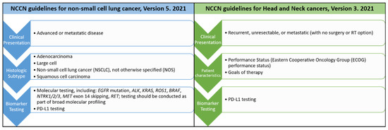 Compared to the hematologic diseases, solid tumors are more complex and involve not only tumor cells but also their microenvironments [13]. Thus, the application of precision medicine in solid tumors began later than in hematologic neoplasms. However, precision medicine is now a reality for patients with non-small cell lung cancers (NSCLC). Comparison of the most updated cancer treatment guideline from The National Comprehensive Cancer Network® (NCCN®) for non-small cell lung cancers [14] and head and neck cancers [15] is shown in Figure 3.