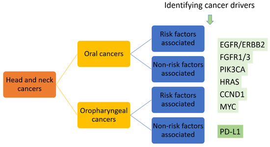 Similar to the precision medicine applied in NSCLC patients, two major approaches might be taken into consideration. First, broad use of genome-sequencing to profile the genetic landscape of oral cancers should be performed to establish the foundation of precision medicine. This is the use of genetic profiles to identify the selected patients who have the known druggable targets, such as activation of PIK3CA in 34–56% of HNSCC patients and HRAS mutation identified in 5% of HNSCC patients [7]. Second, further identifying and targeting the drivers for oral cancers should be performed. As mentioned, the driver oncogenes show more promising results as targets for developing targeted therapies. We propose to separate head and neck cancers into oral cancer and oropharyngeal cancer groups, separate them again into risk factors-associated or -non-associated groups, then use NGS to identify cancer drivers or screening of known druggable targets such as EGFR, FGFR and PIK3CA alterations, HRAS, CCND1 and MYC mutations, which have been identified in oral cancers [7], in addition to PD-L1 in these patients, to reach the initial precision medicine in oral cancer patients (Figure 4).