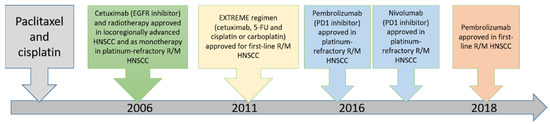 The choice of treatment in oral cancer is mainly based on the stage of the disease [40]. For patients presenting with early-stage disease (stage I or II), single-modality treatment with surgery or radiotherapy is generally recommended. Compared to other cancers in the body, oral cancers are easily accessible, and thus surgery is the first choice of treatment and is associated with high cure rates [41]. Combined therapy is generally recommended for patients with locally or regionally advanced disease at diagnosis. The current approved targeted drugs in head and neck cancer include cetuximab and pembrolizumab [5,42,43,44,45,46,47,48]. The timeline of these major therapeutic approaches in recurrent/metastatic head and neck squamous cell carcinoma is illustrated in Figure 5. The efficacy of these targeted drugs will be described below.