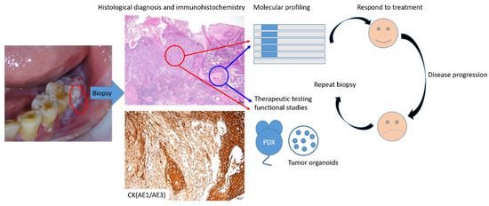 Unlike the malignancies in the internal organs, oral precancerous or cancerous lesions can be identified using the naked eye. Upon careful examination, experienced specialists, such as oral pathologists or oral surgeons, can recognize lesions without much difficulty. Local recurrence or regional relapse are the major issues for oral cancers. Due to field cancerization, new tumors can grow from positive or dysplastic margins or even other previous dysplastic regions. Unfortunately, although we can recognize the lesions, no preventive treatment to reverse or cease the tumorigenesis process is available. Eradicating the precancerous lesions by either blade or laser or cryotherapy or photodynamic therapy is the current treatment recommendation. Due to field cancerization, nearly “normal” section margins can not be achieved in patients with risk factors. The other major challenges of monitoring oral cancers or precancerous lesions are encountered when patients have severe trismus either due to submucosal fibrosis caused by a betel nut chewing habit or when tumor nests are growing underneath the dense fibrotic scaring surface. The potential of liquid biopsy in head and neck cancer has been studied and might have potential application for monitoring these patients in the future [86]. The aforementioned PDX and tumor organoids might also help to develop and evaluate novel treatments for the oral cancer patients in the future (Figure 6).