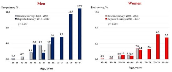 In cross-sectional analysis, the prevalence of AF in the cohort population increased from 1.6% (n = 146/9255) at the age of 45–69 years (1.1% in women and 2.1% in men) to 4.2% (n = 164/3878) at the age of 55–84 years (3.0% in women and 6.1% in men) over the 13-year follow-up period (Figure 1).