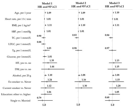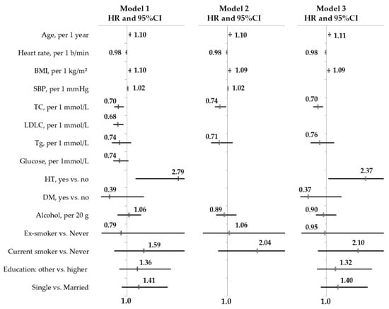 In women (Table 3, Figure 3), in age-adjusted models, the risk of incident AF was positively associated with the value of BMI (HR = 1.10; 95% CI 1.05–1.15), SBP (HR = 1.02; 95% CI 1.01–1.03), or the presence of HT (HR = 2.79; 95% CI 1.30–5.99), and negatively related to TC (HR = 0.70; 95% CI 0.55–0.89) and LDLC (HR = 0.68; 95% CI 0.52–0.88). These relationships remained significant in models 2 and 3 independent of biological, behavioral, and social factors, except for the value of LDLC.