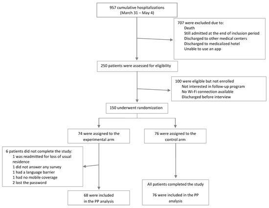 Patients were eligible if they met the following inclusion criteria: aged 18 years or older; availability of a mobile device, such as a smartphone or a tablet with internet connectivity; and hospital discharge after admission for COVID-19 diagnosed by real-time polymerase chain reaction (RT-PCR). Patients were excluded if they were health care professionals (physicians or nurses), or had been discharged to health care facilities or medicalized hotels to complete the isolation period.