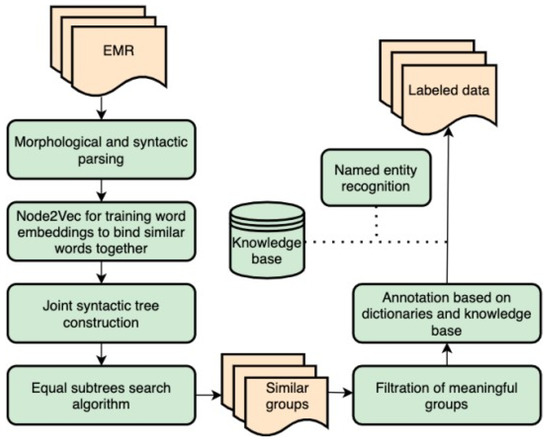 The key contributions of this work are a design of a new methodology for automatic annotation of EMRs, a proposed method for finding similar subtrees in a tree, a successful application of a classic Node2Vec algorithm to syntactic trees, and a creation of a medical Wikidata-based database for labeling in Russian. The whole pipeline can be adapted to other languages by changing the language-specific preprocessing module. Additionally, a corresponding database can be created by changing a language code. For Russian, a graphic interface was implemented for annotating new datasets with statistical representation.