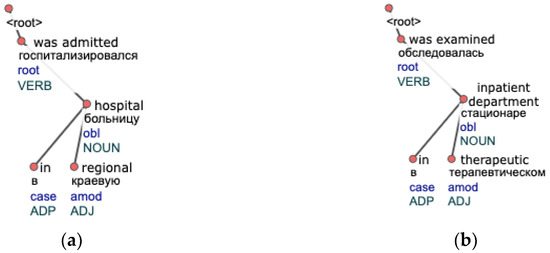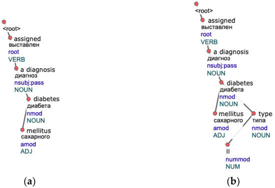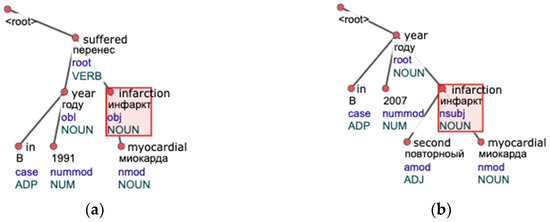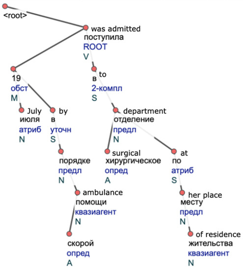 Syntactic and morphological analyzers are used to extract information about sentence structure. This procedure ensures that groups with similar semantic constructions share the same structural meaning. In this research, we use a neural model for morphological tagging, as it showed promising results before [19]. We utilized a high performant graph-based parser with neural attention suggested by [20] for syntactic parsing. Both approaches were implemented for the Russian language by the DeepPavlov project [21]. Several studies proved that parsing of medical text is better with a model that is also trained on medical data [22,23]. However, we did not have labeled data for re-training, so we used a model already trained on a UD Russian SynTagRus corpus (version 2.3).