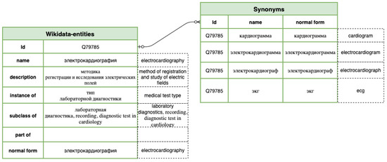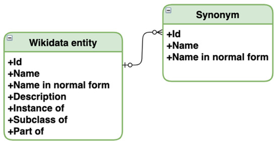 We have fetched only Wikidata entities with the specified properties for compiling the database. Interaction with the knowledge graph and fetching entities was done with queries in the specialized query language SPARQL and the public MediaWiki interaction interface. Then, only those entities remained that have their names available in Russian translation, leaving only about a third of initially fetched. For these entities, synonyms and names associated with each other with inheritance relationships are found on the Wikidata graph (as mentioned, inheritance relations are: “instance of”, “subclass of”, “part of”). In addition to the data obtained from Wikidata, we also normalized entities’ names, as the algorithm for searching similar partial repeats works with the normal forms of words. Figure 7 depicts the resulting database schema, where we have aggregated all fetched and filtered categorical information from Wikidata. We stored entities with hierarchical relations in one table and linked synonyms to existing entities in another table.
