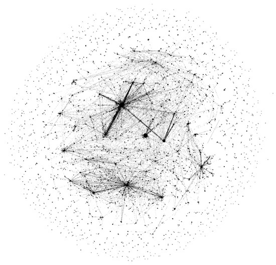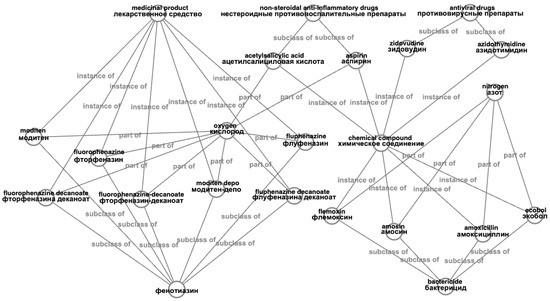 The resulting number of medical entities retrieved by the specified algorithm is 18.9 k entities and 17.1 k synonyms. From the compiled database, the appearance of the knowledge graph in Wikidata can be partially reconstructed, although greatly simplified, which uses only inheritance relations as links. Figure 10 shows the knowledge base graph, where the “name” field from both tables and category names are the vertices and inheritance relations are the edges. There are many sets with a small number of vertices that are specific and have few related entities. At the same time, in the center, extensive concepts such as “cure”, “disease”, and “chemical compound” link many entities together.