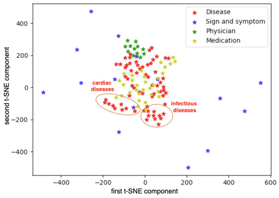 Figure 12 shows medical terms in the text of EMRs marked after labeling with vocabularies. First, the embedding of each word was obtained from the resulting vector spaced received by training a CBOW model with the Node2Vec method. Then, they are visualized with a t-SNE method.