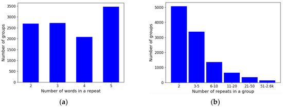 Our algorithm extracted nearly 8.2 k groups in total. Frequency statistics of the size of groups are shown with bar charts in Figure 13. It is noticeable that groups are most commonly small and consist of up to 10 repeated phrases. Therefore, the maximum repeat length was limited to five words to keep groups short and informative.