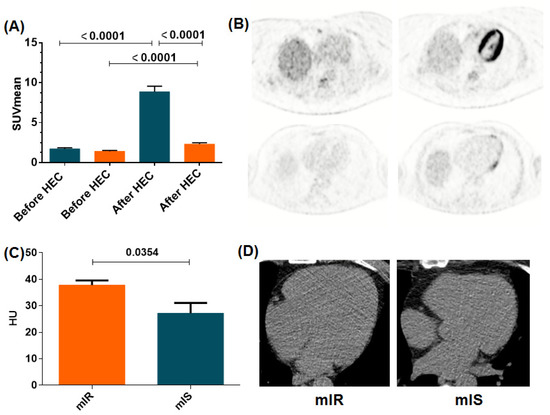 All patients showed low left ventricle myocardial 18F-FDG uptake at the baseline scan, close to the background-to-noise signal. However, after HEC, 17 (39.5%) showed a pronounced enhancement in myocardial 18F-FDG uptake (1.59 [1.42–1.92] SUV vs. 7.67 [7.10–9.49] SUV) indicative of an insulin-sensitive myocardium (mIS), whereas 26 (60.4%) showed only a marginal increase in 18F-FDG uptake (1.18 [1.06–1.59] SUV vs. 2.27 [1.62–2.93] SUV), thus revealing the presence of mIR (Figure 1A,B).