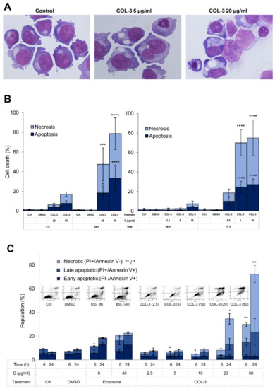 COL-3-induced cytotoxicity in K562 cells. K562 cells were treated with COL-3 (C, 2.5–50 µg/mL) for 72 h. May–Grünwald-stained cells with morphological features of apoptosis (chromatin condensation) and necrosis (increased cell size and cytoplasmic vacuolization) (A) were counted as a percentage of 400 cells per slide (B). (C) The cells were also stained with Annexin V and PI and subsequently analyzed by flow cytometry. Necrotic cells were designated as PI+/Annexin V− cells, whereas PI−/Annexin V+ cells and PI+/Annexin V+ cells were considered as early and late apoptotic cells, respectively. In (B,C), cells treated with etoposide (E, 40 µg/mL) were used as the positive controls, while vehicle DMSO (D)-treated and/or untreated cells were employed as normal controls. Representative flow cytometry images for treatments after 24 h are shown in the upper part of Figure 2C. Results are expressed as the mean ± SD of three independent experiments. *: p < 0.05; **: p < 0.01; ***: p < 0.001, and ****: p < 0.0001.