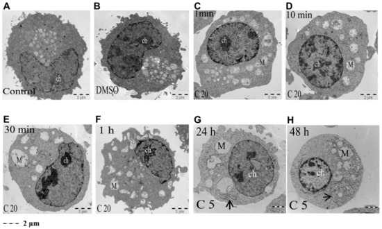 COL-3-induced morphological changes assessed with TEM (low magnification). K562 control cells were left untreated (A) or were treated with vehicle DMSO (B) or with 20 µg/mL COL-3 for 1 min, 10 min, 30 min and 1 h (C–F, respectively) and 5 µg/mL COL-3 for 24 h and 48 h (G,H, respectively). Thereafter, ultrastructural morphology was assessed by TEM. M = mitochondria; ch = chromatin; arrows indicate ER.