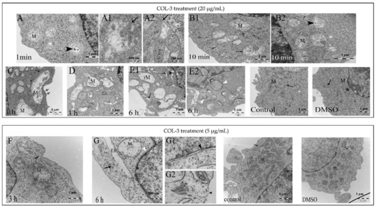 Treatment of K562 cells with a high concentration of COL-3 (20 µg/mL) induced rapid (within 1 min) mitochondrial (M) swelling (Figure 4A) along with cristae that had disintegrated into vesicular and tubular structures (Figure 4A1,A2). Upon prolongation of the treatment time (10 min, 30 min, 1 h, 3 h and 6 h), this mitochondrial swelling/rupture became more pronounced and, in addition, a progressive dilatation of the ER with detached ribosomes and chromatin condensation was observed (Figure 3D–F and Figure 4B1,B2,C,D,E1,E2).