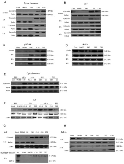 The role of mitochondria and DNA damage in COL-3-induced cell death. Cells were treated with COL-3 (C, 2.5–50 µg/mL) for 72 h and processed for subcellular fractionation and Western blotting as described in the Materials and Methods section. Controls included etoposide-treated cells (positive control) (E, 6 or 40 µg/mL), DMSO treated (vehicle control) and untreated cells. Cytosolic translocation of cytochrome c (A,E) and AIF (B,F); protein expression of γH2Ax (C); AIF nuclear translocation (G); protein expression of Bcl-xL (H). (D) represents the house-keeping protein (Actin, 42 kDa) associated with (A–C). COX IV = cytochrome c oxidase complex IV subunit II; mt = mitochondrial-rich fraction.