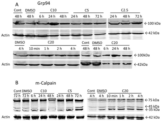 It is well established that specific ER stress signaling pathways (known as the unfolded protein response UPR), are required for the maintenance of ER homeostasis. The UPR is triggered when the ER protein folding capacity is overwhelmed by cellular demand and the UPR initially aims to restore ER homeostasis and normal cellular functions. However, if the restoration of ER homeostasis fails, the UPR triggers cell death [17]. To investigate the role of ER dilatation in COL-3-induced cell death, we performed WB analysis on the protein expression pattern of Grp94 and m-calpain, the two ER proteins that play a crucial role in cell death caused by ER stress [18]. Grp94-protein expression increased after COL-3 treatment (Figure 6A). The activation of m-calpain was detected by the presence of two cleavage products of 35 and 45 kDa. COL-3 (20 µg/mL) induced m-calpain cleavage within 10 min and lower concentrations of COL-3 induced this cleavage at later points (Figure 6B).