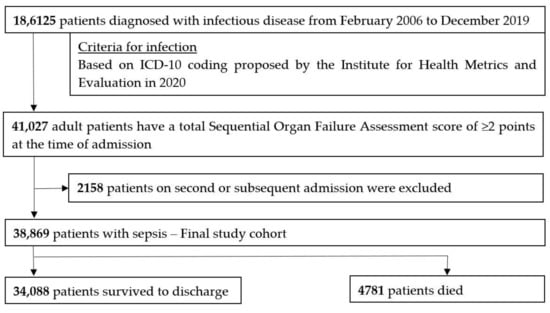 We included all patients who required unplanned hospital admission and were diagnosed as having sepsis from 1 February 2006 to 31 December 2019. In this study, sepsis was defined as having a proven/suspected infection and the development of organ dysfunction according to the Sepsis-3 criteria. Organ dysfunction in this study was defined as a total SOFA score of ≥2 points at the time of admission because pre-existing organ dysfunction was not sufficiently recorded and Sepsis-3 suggested that the baseline SOFA score could be assumed to be zero in patients not known to have preexisting organ dysfunction []. A proven/suspected infection was defined as having any of the infection-related ICD-10 codes previously proposed by the Institute for Health Metrics and Evaluation [] in the primary diagnosis or the diagnosis that triggered hospitalization. The detailed set of the ICD-10 codes for the presence of infection is listed in Table S1. We excluded patients who were admitted to hospital with a diagnosis of sepsis more than once during the study period (i.e., had a second or subsequent record of admission).