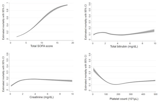 The detailed association between the biomarkers of the SOFA subscores and mortality was evaluated using non-linear methods, and the interaction effects of modified SOFA subscores on mortality were evaluated by dichotomizing each SOFA subscore into the higher score (2-point or more) or the lower score (1-point or less). To evaluate the non-linear association between mortality and the biomarkers and to visually provide comprehensible information about the significances of each cutoff point of the SOFA subscores, we constructed restricted cubic spline curves using logistic regression models. The knot values were determined based on Harrell’s recommended percentiles, with the knots placed at equally spaced percentiles of the original variable’s marginal distribution []. The number of knots in each analysis was determined by the Wald test in such way that the explanatory variables at all sections divided by the knots were significant (Table S3) [].