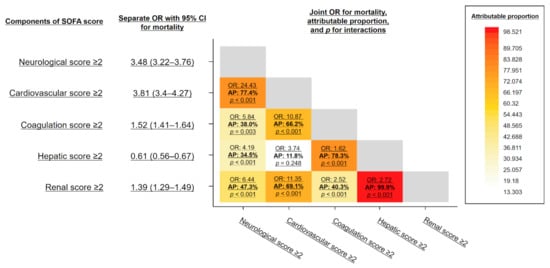 The cross-interaction effects on mortality between SOFA subscores are summarized as a heat map corresponding to the attributable proportion of the joint odds ratios of the SOFA subscores positive (2-point or more increase) on mortality (Figure 4). Each cell contains the following: on the first line, the joint mortality odds ratios of the simultaneous increase in two SOFA subscores above 2 points; on the second line, the attributable proportion of the joint effects to interaction between the increases of the two SOFA subscores; and on the third line, the p value for the two-way interactions on mortality between the increases of the two SOFA subscores. As a result, the joint odds ratios on mortality of two SOFA scores were synergistically increased compared to the sum of the single odds ratios with high attributable proportions, and the interactions were statistically significant in almost all subgroups. In particular, the cardiovascular-neurological, coagulation-hepatic, and renal-hepatic combinations were associated with remarkably higher attributable proportions (77.4%, 78.3%, and 99.9%, respectively).