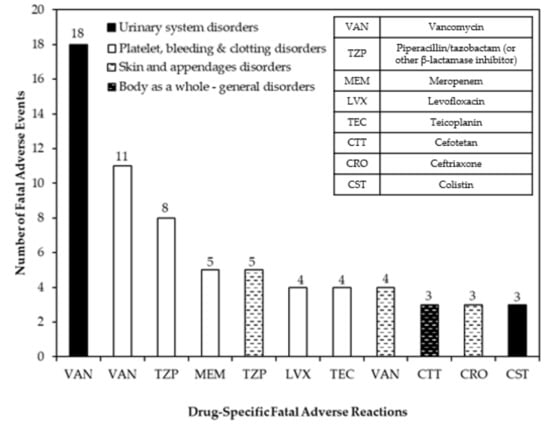 Among the fatal adverse drug reactions associated with antibacterial agents, specific antibiotic-induced adverse reactions leading to at least three fatal cases over the study period are summarized in Figure 1. All of the reported fatal adverse reactions associated with the antibacterial agents are typical of each medication as stated in their prescribing information [21]. The most predominant drug-specific fatal adverse reaction was vancomycin-induced urinary system disorders (e.g., nephrotoxicity) (n = 18); followed by platelet, bleeding, and clotting disorders (e.g., thrombocytopenia) caused by vancomycin (n = 11) and piperacillin/β-lactamase inhibitor (n = 8). Although much less common, the following immune-mediated, hypersensitivity reactions were also implicated in death: skin and appendages disorders (e.g., skin eruption) induced by piperacillin/β-lactamase inhibitor (n = 5), vancomycin (n = 4), and ceftriaxone (n = 3); and general disorders (e.g., anaphylactic shock) resulting from cefotetan (n = 3).