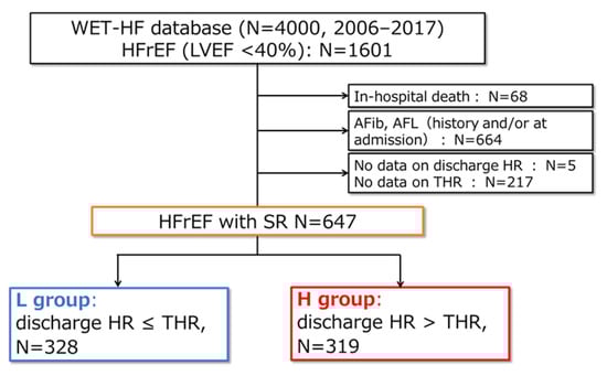 Flowchart of the study. The L group was defined as the patients whose discharge HR was less than or equal to the THR calculated by the following formula (THR [bpm] = 93 − 0.13 × Dct [ms]), and H group was defined as those whose discharge HR is higher than the THR. WET-HF: West Tokyo Heart Failure, HFrEF: heart failure with reduced ejection fraction, AFib: atrial fibrillation, AFL: atrial flutter, discharge HR: heart rate at discharge, THR: target heart rate, SR: sinus rhythm.