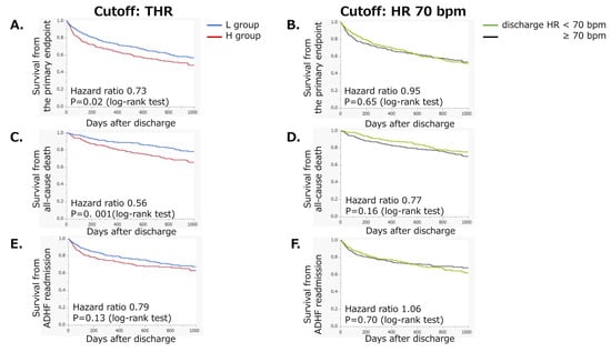 A total of 125 deaths (L group, 50; H group, 75) and 165 ADHF readmissions (L group, 79; H group, 86) occurred during the first 1000 days after discharge. In the Kaplan-Meier curve, the L group showed a significantly lower rate of the primary endpoint (p = 0.018, log-rank test, Figure 2A), defined as the composite of all-cause death and readmission for ADHF. In contrast, no significant difference in the incidence of the primary endpoint divided by a uniform cutoff value of discharge HR of 70 bpm was found between the two groups (Figure 2B). All-cause death was also less common in the L group (p = 0.001, Figure 2C), whereas no significant difference was observed between the two groups when divided by a uniform cutoff value of discharge HR of 70 bpm (Figure 2D). No significant difference in cardiac death was found between the L and H groups (p = 0.17); however, there was a significant difference in non-cardiac death (L group, 11; H group, 27, p = 0.005). ADHF readmission rate did not significantly differ when dividing the study population by THR (Figure 2E) or 70 bpm (Figure 2F).
