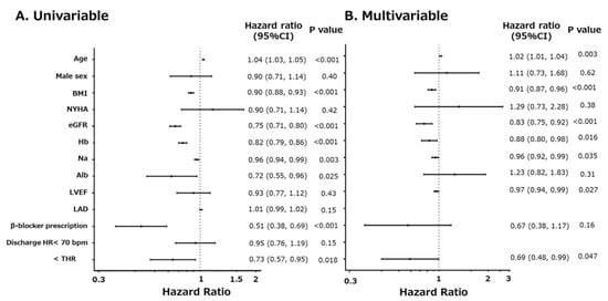 Cox proportional hazards model analysis was performed to determine the independent association of the variables with the primary endpoint (Figure 3). Univariable analysis revealed that age, low BMI, low eGFR, low hemoglobin (Hb) level, low serum Na level, low serum Alb level, no β-blocker prescription at discharge, and discharge HR ≤ THR showed significant association with the primary endpoint (Figure 3A). Conversely, discharge HR < 70 bpm was not significantly associated with the primary endpoint (Figure 3A). Multivariable analysis revealed that the association of discharge HR ≤ THR with the primary endpoint remained significant after adjustment for covariates (Figure 3B).