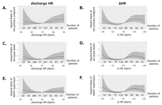 Restricted cubic spline analysis depicting the association of discharge HR or ΔHR with a hazard ratio of (A,B) the primary endpoint, (C,D) all-cause death, and (E,F) ADHF readmission. ΔHR was defined as the difference between discharge HR and THR. Hazard ratio was adjusted for the covariates shown in Figure 3B (age; sex; BMI; NHYA; eGFR; Na, Hb, and Alb levels; LVEF; and β-blocker prescription). HR: heart rate at discharge, THR: target heart rate, BMI: body mass index, NYHA: New York Heart Association functional class, eGFR: estimated glomerular filtration rate, Hb: hemoglobin level, Na: serum sodium level, Alb: serum albumin level, LVEF: left ventricular ejection fraction.