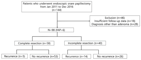 A total of 144 consecutive patients were screened during the study period. Notably, 46 patients were excluded due to the following reasons: (1) insufficient follow-up data (n = 18) and (2) no suitable indication for ESP (n = 28, pancreatic intraepithelial neoplasia 2 or chronic papillitis, heterotopic pancreas, neuroendocrine tumor, etc.) (Figure 1). Therefore, a total of 98 patients were included in the analysis. The median age was 56 years (interquartile range (IQR), 48–66 years), and 64 patients were men. Six patients were diagnosed with FAP. One had previous history of bile duct resection with hepaticojejunostomy. All patients did not show jaundice and they did not undergo routine endoscopic biliary sphincterotomy with biliary decompression (Table 1).