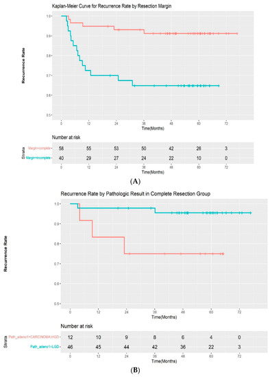 Descriptive statistics, including means, standard deviations, and percentages, were calculated. Categorical parameters are expressed as frequencies and proportions and compared using the chi-square test or Fisher’s exact test. We used the Kaplan–Meier method to estimate the cumulative adherence and recurrence. The data regarding relapsed patients were treated as censored, as a suitable follow-up schedule was applied for subsequent endoscopic therapy. The adherence rate was analyzed using the Kaplan–Meier method. An additional sub-group analysis with patients with complete resection was performed. All reported p-values are two-sided and a p-value of <0.05 was considered to indicate statistical significance. The data were analyzed using R program version 4.1.0 (R Foundation for Statistical Computing, Vienna, Austria, http://www.R-project.org, accessed on 2 October 2021).