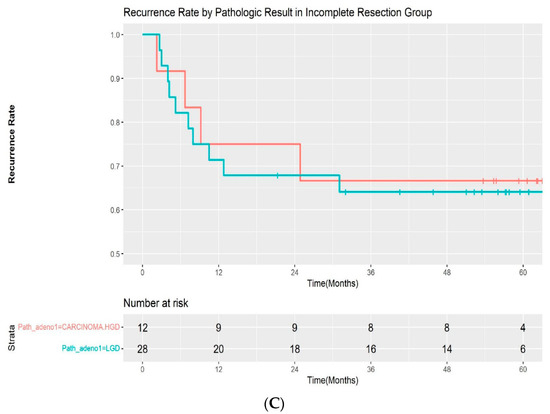 (A) Kaplan–Meier curve for the recurrence rate according to resection margin. (B) Kaplan–Meier curve for the recurrence rate according to pathologic result in the complete resection group. (C) Kaplan–Meier curve for the recurrence rate according to pathologic result in the incomplete resection group. LGD—low-grade dysplasia; HGD—high-grade dysplasia.