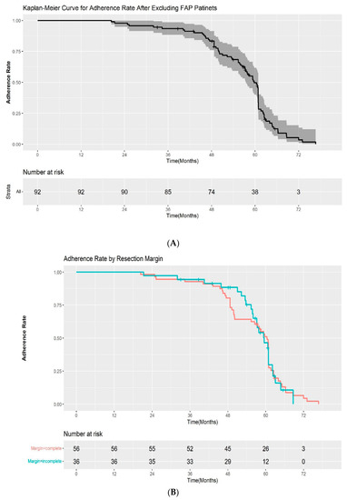 The adherence rate for all study cohorts except the patients with FAP were 100%, 93.5%, and 33.6% at 1, 3, and 5 years after ESP, respectively, in the Kaplan–Meier analysis (Figure 3A). Among the patients with a complete resection margin, the adherence to scheduled follow-up was as follows: 100% at 1 year, 92.9% at 3 years, and 33.4% at 5 years. In the incomplete resection group, the rates of adherence to scheduled follow-up were 100%, 94.4%, and 34.1% at 1, 3, and 5 years, respectively. The difference in the adherence rate between the two groups was not statistically significant by log-rank test (p = 0.2) (Figure 3B). We also evaluated the adherence rate according to the pathological results after ESP (high-grade dysplasia/adenocarcinoma vs low-grade dysplasia). The 1, 3, and 5-year adherence rates after ESP were 100%, 95.7%, 42.5%, and 100%, 92.7%, and 31.4% for patients with high-grade dysplasia/intramucosal adenocarcinoma and low-grade dysplasia, respectively. Although the adherence rate at 5 years was higher in the high-grade dysplasia/adenocarcinoma group, the difference was also not statistically significant (p = 0.9) (Figure 3C).