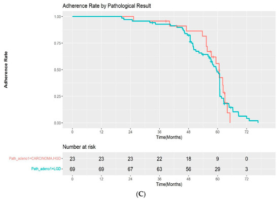 (A) Kaplan–Meier curve for the adherence rate to endoscopic surveillance after endoscopic snare papillectomy after excluding FAP patients. (B) Kaplan–Meier curve for the adherence rate to endoscopic surveillance after endoscopic snare papillectomy according to resection margin. (C) Kaplan–Meier curve for the adherence rate to endoscopic surveillance after endoscopic snare papillectomy according to pathological results. HGD—high-grade dysplasia; LGD—low-grade dysplasia.