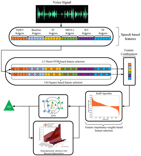 Parkinson’s disease (PD) is defined as a kind of progressive and neurological disorder that causes permanent cessation of brain cells and that is generally diagnosed at ages of above 60 years [1]. If PD is diagnosed at an early stage, the progress of the disease is significantly slowed down with appropriate treatment methods. PD has motor and non-motor symptoms, such as vocal disorders, tremors, slowness, visceral/musculoskeletal pain, stiffness, sadness, increased anxiety, pessimism, and loss of pleasure at early stages [2]. Since the vocal disorders in PD are the most significant symptom for early diagnosis, specialists have focused on abnormalities in voice characteristics, such as loss of freshness, color, and strength of volume [3,4]. The diagnosis of PD generally includes experiments, invasive methods, and empirical tests that have reliability problems. Moreover, these methods are neither cost-effective nor practical due to the use of mixed equipment structures. Additionally, specialists may make a wrong decision due to absent-mindedness or workload as a result of so many transactions [5]. For these reasons, the detection of early stage PD using machine learning methods from voice signals is a turning point to prevent redundant visitations to clinics, decrease the caseload of doctors, and increase the possibility of controlling the illness to achieve recovery and treatment. Moreover, these approaches are cost-effective, simple, and more accurate [6].