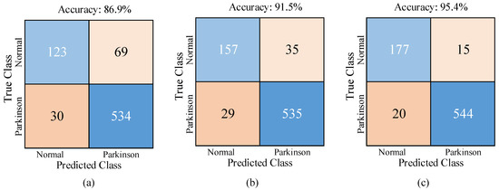 Confusion matrices for three different cases: (a) The Fine KNN without feature selection; (b) The Fine KNN with the CLS feature selection; (c) The optimized KNN with the CLS feature selection.