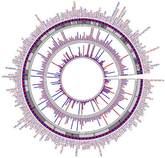 Circular plot of 212 asthma loci. Plot summarizing the 212 asthma loci described in Han et al. [35]. The first (outer) track shows the gene(s) representing the loci in alternating colors (red and blue). The second track with alternating shades of grays represents the chromosomes. The third track represents the association p-value from the UKBB + TAGC meta-analysis; each line represents −log10P of the strongest signal in the loci (for clarity, lines are truncated to ≤25). The innermost track represents the replication of each locus. Asthma GWAS loci with significance association p-value < 5 × 10−8 were accessed from the GWAS Catalog ((https://www.ebi.ac.uk/gwas/home, accessed on 10 December 2021), and the number of hits for each loci was counted. All replications of 17q12-21 were merged to a single locus. The lengths of the lines show the number of hits (for clarity, lines are truncated for lengths up to 20).