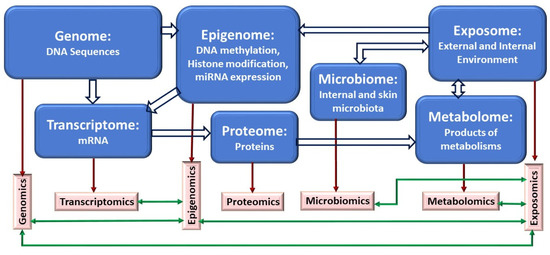 Exposomics is the study of environmental exposures (i.e., the exposome) and their effects on health and disease. Exposures may include aspects of the natural (e.g., air, water, and soil quality) and built environments (e.g., quality of workplace and housing, and access to fresh produce), as well as other chemical exposures and/or pollutants. These factors may exert biological responses, including inflammation, proinflammatory cytokine secretion, methylation, and gene expression changes, as well as increased responsiveness to cortisol. These responses can result in modifications to the epigenome, gene expression, and microbiome, and they could be linked with functional changes associated with diseases including asthma [140,141]. Asthma is a prototype of complex traits with both genetic and environmental causes. Environmental factors implicated in asthma risk include air pollution, smoking, environmental microbiotas, allergens, diet and nutrition [142,143,144,145]. Solid evidence exists for the association between childhood asthma risk and exposure to secondhand smoke (SHS) both pre- and postnatally [146,147]. Moreover, SHS has been found to interact with genetic factors to increase asthma risk [148,149,150]. Exposures to environmental microbial communities are believed to have a profound influence on the developing immune system. Evidence that children growing up on farms have a lower risk of asthma and other allergies was among the observations that led to the formulation of the so-called hygiene hypothesis, which stipulates that early-life exposures to diverse “friendly” microbiotas help protect against allergic disease by training the immune system to respond appropriately [151].