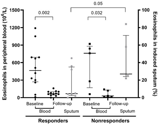 Significant differences were found in the level of airway eosinophilia (Figure 1). According to the criteria of the cytology laboratory [24], four samples were not representative (all of them from the group of responders). The median percentage of eosinophils in induced sputum on anti-IL-5 therapy was 27.0% in nonresponders (IQR 24–71), and 4.5% in representative responder samples (IQR 2.5–35) after 16 weeks of anti-IL-5 therapy.