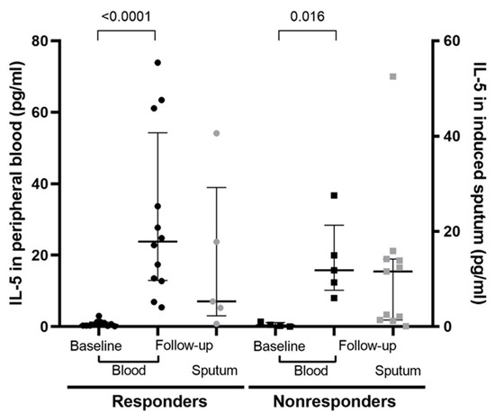We also analysed IL-5 concentrations in 16 induced sputum samples taken during treatment only. No statistically significant differences were found between responders and nonresponders after the introduction of mepolizumab (p = 0.743).