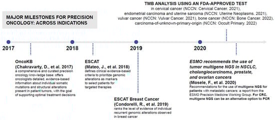 Several MGTOs (see Box 1) are now approved for different tumor types by the US Food and Drug Administration (FDA), the European Medicines Agency (EMA), and other regulators, with many ongoing clinical development programs investigating MGTOs and genomic testing in these patients []. In addition, there are also companion diagnostic assays derived from liquid- and tissue-based NGS panels for use in solid tumors that have been approved by the FDA []. In addition to these regulatory approvals, the US National Comprehensive Cancer Network (NCCN) now recommends multigene panel testing for a number of other tumor types, also by using NGS [,,,,,,]. This began with non-small cell lung cancer, but has since expanded to colon, prostate, breast, ovarian, carcinoma-of-unknown-primary-origin, and bone cancer [,,,,,,]. Analysis of tumor mutational burden by an FDA-approved test is also recommended for cervical cancer, uterine neoplasms, vulvar cancer, carcinoma-of-unknown-primary-origin, and bone cancer [,,,,]. Furthermore, the European Society for Medical Oncology (ESMO) Precision Medicine Working Group 2020 recommended NGS for daily clinical practice in several tumor types []. Additionally, some trials have demonstrated the feasibility of integrating NGS into routine clinical practice [,]. The growing support for genomic testing in guidelines is summarized in Figure 1. However, such support does not necessarily translate to equitable access to NGS within and across countries.