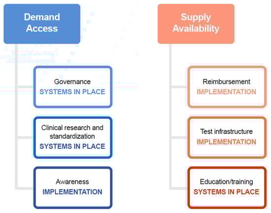 More specifically, the main challenges relate to the demand for tests (which is influenced by governance, clinical standardization, and awareness and education) and supply of tests (influenced predominantly by equitable reimbursement, infrastructure for conducting and validating tests, and testing access driven by evidence generation; Figure 3). The panels also made recommendations for boosting NGS implementation, as detailed in Section 4.