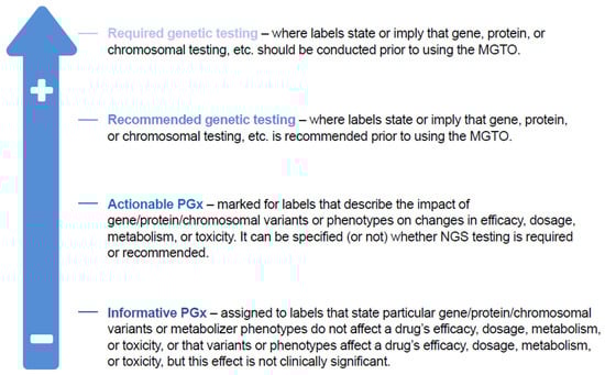 Figure 4. PharmGKB classification of PGx information associated with specific gene–drug combination. MGTO, molecularly guided treatment option; PGx, pharmacogenomics. Adapted from Kim J. A., et al., 2021 []. - Clinically useful MTBs: MTBs are critical to accommodate the ever-evolving environment of NGS and precision oncology, to harmonize interpretation of NGS results and thus aid translation into clinical action and benefit []. To maximize its clinical utility, it is necessary to clearly define the purpose of an MTB, to establish guidelines on minimal membership, operational requirements, and measures of quality, and to secure global harmonization in the sharing of clinical data experiences between institutions. It is also critical to accommodate virtual MTBs in a time- and location-independent manner between cancer care teams comprising experts across several disciplines. MTBs must be reactive and adaptive to recent clinical trial results and capture patient outcomes to validate clinical decision-making as well as support a learning healthcare system. Several further country-specific recommendations are summarized in Table 1.
