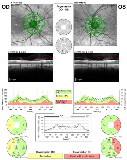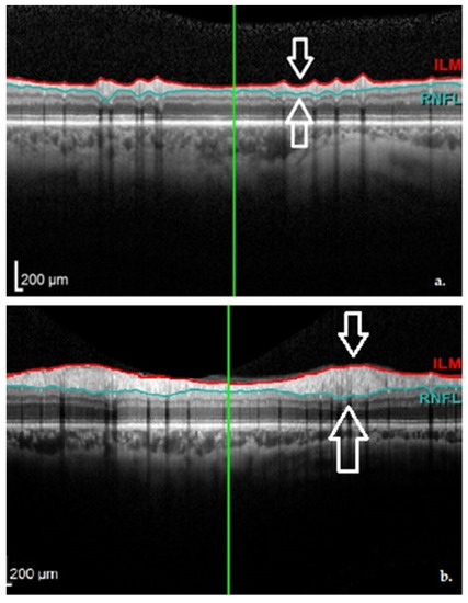 Optical coherence tomography (OCT) is a non-invasive, easy-to-perform technique, which uses the infrared light to scan the retinal structure. Some authors compare OCT (near histological detail: 7 µm axial and 14 µm transverse resolution) with ultrasonography (150 µm axial resolution of a conventional B-mode image), because of the similar principles involved in the scanning process. The value of OCT is well established in ophthalmology, but it has recently grown to provide neurologists with important information regarding the retinal changes in different neurological diseases (e.g., multiple sclerosis and Alzheimer’s disease). Because the retina is part of the central nervous system, it is important to have a tool that can analyze it in vivo, non-invasively [4,5,6,7,8,9].