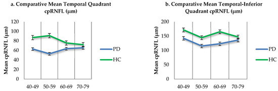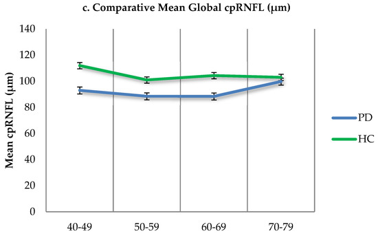 The graphical representation for the comparison of the mean cpRNFL values (µm) of the temporal, TI quadrants, and global values in the PD sample (blue) and controls (green), according to each age group, is visualized in Figure 3.