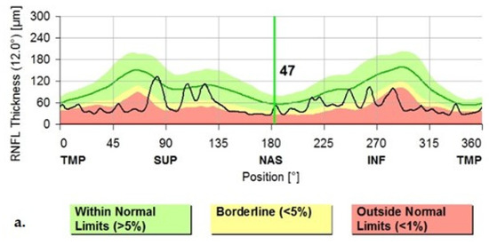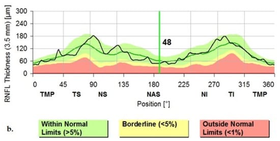 (a) The Graphical Analysis of the cpRNFL values in a PD patient (note the black line); (b) The Graphical Aspect of the cpRNFL values in a normal subject (Images from our study). TMP—temporal; TS—superior-temporal; NS—nasal-superior; NAS—nasal; NI—inferior-nasal; TI—inferior-temporal.