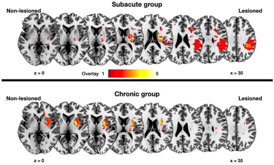 Lesion overlapping maps of the subacute and chronic groups. The color scale indicates the number of overlapping lesions across the patients. Lesioned: Lesioned hemisphere; Non-lesioned: non-lesioned hemisphere; z: z-axis in the Montreal Neurological Institute space.