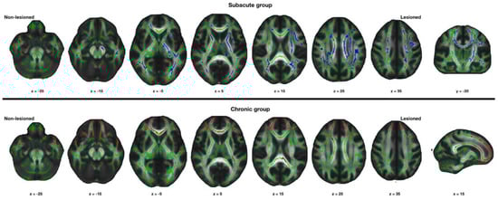 All MRI scans were acquired using a 3-T MR scanner (Siemens, Erlangen, Germany) with a 20-channel head coil. High-resolution three-dimensional (3D) T1-weighted images and DTI scans were obtained. Detailed parameters of the T1-weighted images and DTI are shown in Table 2. For lesion volume measurements, a neuroradiologist constructed each patient’s lesion on the T1-weighted images in the native space using the 3D slicer software (https://www.slicer.org accessed on 20 December 2017). For analysis, the DTI was registered to the corresponding b = 0 image with an affine transformation to amend the distortions attributed to the eddy currents (FSL 5.0.10; http://www.fmrib.ox.ac.uk/fsl). Fractional anisotropy (FA) maps were subsequently constructed in the native space. T1-weighted images and DTI of 13 right hemispheric lesions were flipped to align the corresponding lesion area in the left hemisphere. Voxel-based lesion symptom mapping was employed to compare the two groups for identifying the lesion effect. Voxel-based lesion symptom mapping showed no significant lesion differences between the groups (Figure 1). Trac-based statistical analysis of the FA maps was performed using the FMRIB Software Library [14]. FA maps were non-linearly registered to the Montreal Neurological Institute space. The registered FA maps for the patients and controls were projected onto the mean FA skeleton, representing the centers of the common fiber bundles. The resulting maps were fed into voxel-wise statistical analyses to compare patient and age-matched control groups. The statistical analyses were performed with the threshold-free cluster enhancement nonparametric permutation test, using 5000 Monte Carlo simulations [14]. The statistical threshold was set at a corrected p-value of less than 0.05. The group characteristics were compared using the two-sample t-test with R version 3.5.2 (R Foundation for Statistical Computing, Vienna, Austria).