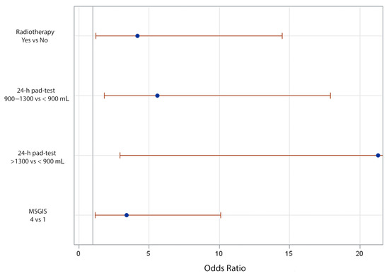 Table 3 presents the corresponding odds ratios and confidence interval limits for each preoperative variable predictive of failure with ATOMS implant in the univariate analysis: Charlson comorbidity index, radiation, prostate cancer risk-group, previous urethroplasty, MSGIS group, PPD, 24-h pad-test, and ICIQ-SF total value. The multivariate analysis revealed MSIGS (category 4 vs. category 1; OR 3.412 (95% C.I. 1.159–10.095); p = 0.0244), radiotherapy for prostate cancer treatment (yes vs. no; OR 4.186 (95% C.I. 1.225–14.472); p = 0.0216), and 24-h pad-test (>1300 mL vs. ≤900 mL; OR 21.288 (95% C.I. 2.93–443.628), and 900–1300 mL vs. ≤900 mL; OR 5.591 (95% C.I. 1.802–17.903); p = 0.0171) stayed as independent predictive factors of failure with ATOMS implant (Figure 2).