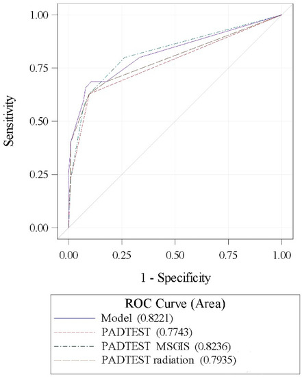 The accuracy of the predictive model defined by the combination of the independent variables of ATOMS failure (radiation, MSIGS, and 24-h pad-test) was 82.21%. The area under the curve for MSIGS and pad-test (82.36%) was superior to that of pad-test alone (77.43%), although the difference did not reach statistical significance (ROC contrast estimation, p = 0.06) (Figure 3).