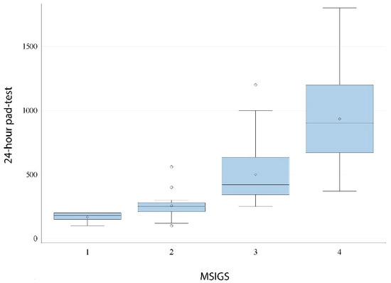 Distribution of 24-h pad-test by MSIGS (Spearman’s ρ = 0.76; p < 0.0001).
