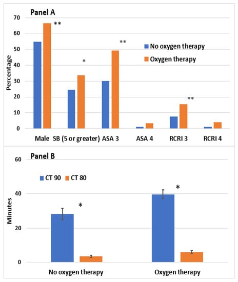 Characteristics of OSA patients receiving oxygen. Vertical bar represents the standard error of the mean. Panel (A) shows the demographic characteristics of patients receiving oxygen therapy. Panel (B) shows the oximetry parameters of patients receiving oxygen therapy. Abbreviations: SB: STOP-Bang score; RCRI: revised cardiac risk index; CT: cumulative time; SpO2: average oxyhemoglobin saturation; ODI: oxygen desaturation index; OSA, obstructive sleep apnea. * p < 0.05, ** p < 0.01.